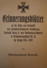Quelle Offiziere (ohne Vornamen und Geburtsort): Erinnerungsblätter an die Taten und Erlebnisse des Infanterie-Regiments Großherzog Friedrich Franz II. von Mecklenburg-Schwerin (4. Brandenburgisches) Nr. 24 im Kriege 1914 – 1918. Von Oberleutnant Gareis