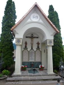 Kleines offenes Kapellchen auf dem Friedhof mit den Namen der Gefallenen beider Weltkriege. Unter den