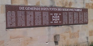 Steinerne Gedenktafel mit den Namen der Gefallenen, Vermissten und in der Heimat Gefallenen an einer Wand neben der evangelischen Kirche