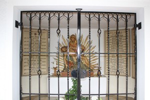 In der Friedhofkapelle am Altar Figur „Maria mit Jesus“, an den Wänden Gedenktafeln