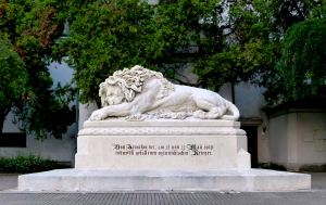 Skulptur eines schlafenden Löwen auf einem Podest am Heldenplatz.