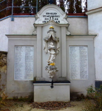 flankiert von zwei Namenstafeln an der Umfassungsmauer der Pfarrkirche