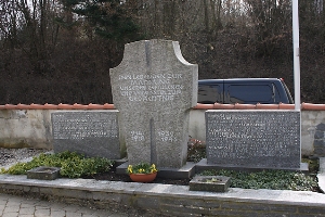 Im Friedhof drei stehende Marmorplatten, mittlere in Form eines Kreuzes