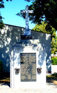 Freistehendes Denkmal gekrönt mit Kreuz neben dem Gemeindeamt.