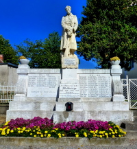 Soldatenstatue auf Sockel flankiert von Namenstafeln neben der Kirche