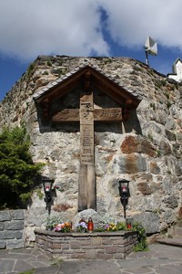 Im Friedhof; an einer Mauer, ein überdachtes Holzkreuz mit Inschrift; zusätzlich Hinweise zu