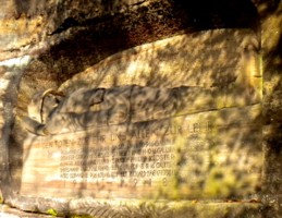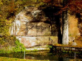 an der Landstuhler Straße. Aus einem schroffen Sandsteinabbruch herausgehauen und dadurch gleichsam in einer Grotte ruhend,