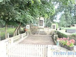 Umzäunte Denkmalsanlage bestehend aus drei Gedenksteinen mit Inschrift und den Namen der Weltkriegsopfer.