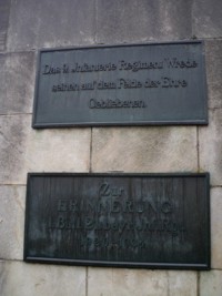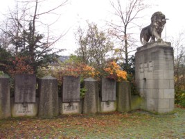 Würzburg (Neuner-Denkmal), Unterfranken, BayernPLZ 97070 Denkmalsanlage für das Infanterie Regiment Nr. Neun und andere Einheiten Würzburgs. Säule gekrönt von einer Löwenfigur mit Gedenktafeln und Feldzugsdaten für das Regiment Neun. Seitlich davon aufgerichtete Steintafeln für andere Regimenter Würzburgs (die Anlage wird allgemein als „Neuner-Denkmal“ bezeichnet)