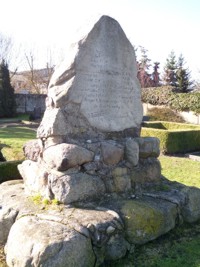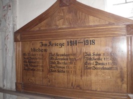 Denkmal 1. Weltkrieg: Findling auf abgestuftem Feldsteinsockel (schlecht lesbar); Gedenktafeln in der Kirche;