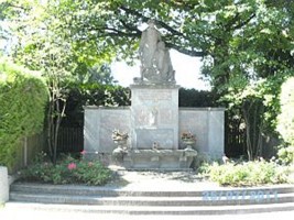 Denkmalsanlage aus Granitstein mit Inschrift und den Namen der Weltkriegsopfer. Verziert mit einer Marienfigur mit Kind und Pflanztrögen. Mittig als Abschluss ein lebensgroßer Soldat mit einem verwundeten Kameraden