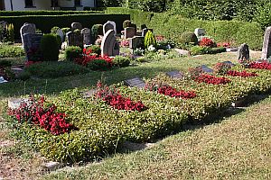 Im Friedhof; a) Tafeln an der Friedhofskapelle; b) Kriegsgräber, eine Reihe am Boden liegender Marmorplatten;