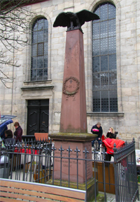 Denkmal 1870-71 mit krönendem Adler vor der St.-Laurentius-Kirche. Die Gefallenen stammten aus den Orten Altdorf,