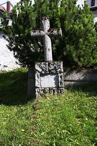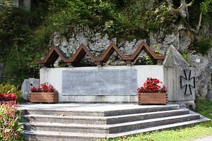 Bei der Bergstation des Sesselliftes; überdachte Betonwand mit Gedenktafel vor dem Felsen; im Friedhof Soldatengrab; zusätzlich Hinweise zu Soldaten von privaten Gedenksteinen