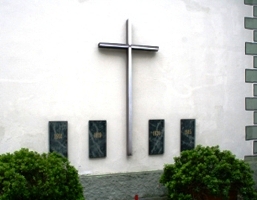 einem großen schlichten Kreuz aus Metall auf Holzkern und vier Tafeln aus dunklem marmoriertem Stein mit
