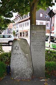 Vor dem Alten Rathaus befinden sich auf einer kleinen Grünfläche zwei Gedenksteine für die verfolgten und ermordeten jüdischen Einwohner der Stadt.