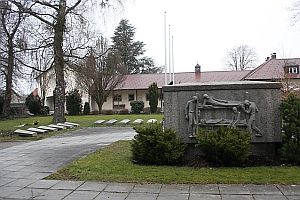 Im Friedhof; in der Mitte Kubus mit Bildreliefs, an drei Seiten rundum leicht gewölbte Bodenplatten;