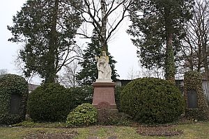 Bei der Kirche; Denkmal, oben Steinplastik „Jesus hält Gefallenen“, Inschriften am Sockel, seitliche zwei mit Efeu