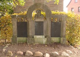 Vor der Kirche dreiteilige Anlage aus hellem Stein, in der Mitte unter einem Steinbogen Stahlhelm auf Eichenkranz, darunter Inschrift und die Namen der Gefallenen des 1. WK, rechts und links davon Metallplatten mit den Gefallenen des 2. WK