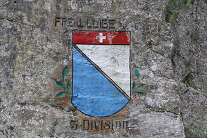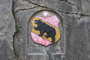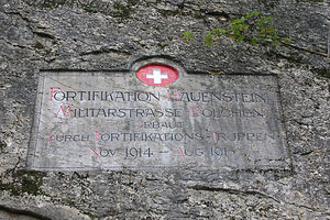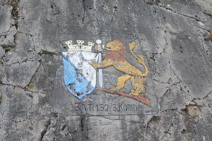 Belchenflue, Kanton Solothurn, SchweizAn der Militärstrasse zur Belchenflue; Wappen von verschiedenen Einheiten an den Felswänden entlang der Strasse; Die Belchensüdstrasse diente während der beiden Weltkriege als Versorgungsstrasse für die "Fortifikation Hauenstein", die den Knotenpunkt Olten und die zentralen Jurapässe schützte. Die hochgelegene, exponierte Gebirgsstrasse wurde im 1. Weltkrieg von Soldaten erbaut und mit zahlreichen Wappen und Inschriften geschmückt.