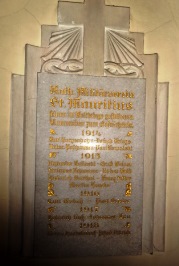 Tafel Katholischer Miltärverein St. Mauritius Katholischer Militärverein St. Mauritius seinen im Weltkriege gefallenen Kameraden zum Gedächtnis… (Namen). Darunter: Relief mit Engeln: Jesus vor deinem schmerzenden Bilde gedenken wir unserer im Weltkriege verstorbenen Brüder. Herr lasse sie in Frieden ruhen.