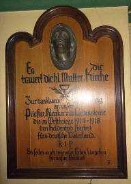 Erinnerungstafel Geistliche 1.Weltkrieg Es trauert die hl. Mutter, die Kirche. Zur dankbaren Erinnerung an unsere Priester, Kleriker und Ordensleute, die im Weltkriege 1914 – 1918 den Heldentod starben fürs Deutsche Vaterland. R.I.P. So sollen auch wir hingeben unser Leben für unsere Brüder.