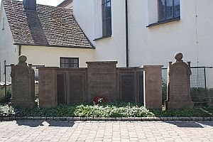 Bei der Kirche; Gedenkwand in einem Halbkreis (2. Weltkrieg), flankiert von zwei äusseren Steinen (1. Weltkrieg);