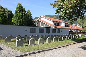 b) davor drei Reihen Kriegsgräber (1. und 2. Weltkrieg);