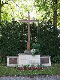 Im Friedhof: Denkmal, darüber Hochkreuz, am Sockel Inschrift und Gedenktafeln