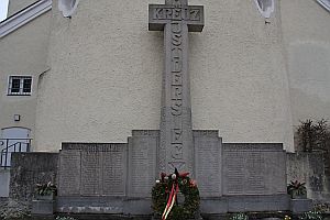 An der Kirche; Gedenkwand, in der Mitte Kreuz mit Inschrift; zusätzlich Hinweise zu Soldaten von privaten Gedenksteinen