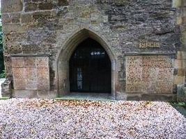 An der Aussenfassade des Kirchturmes sind zwei, aus mehreren Platten bestehende, Gedenktafeln neben dem verschlossenen Eingang zur Gedenkstätte angebracht.