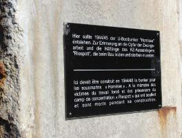 Hier sollten 1944/45 der U-Bootbunker „Hornisse“ entstehen. Zur Erinnerung an die Opfer der Zwangsarbeit und die Häftlinge des KZ-Aussenlagers „Riespott“, die beim Bau leiden und sterben mussten. (Der selbe Text noch einmal in französisch)