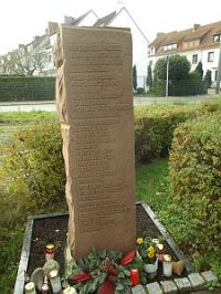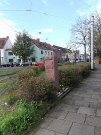 An diesem Platz befand sich ein behelfsmäßiger Erdbunker. Hier starben am 12. Okt. 1944 bei einem Bombenangriff zahlreiche polnische Zwangsarbeiterinnen. Wir gedenken ihrer und der vielen, die aus ihrer Heimat verschleppt in Hastedter Industriebetrieben ausgebeutet wurden. Wir lernen nur, wenn wir nicht vergessen. Evangelische Auferstehungsgemeinde Bremen Hastedt und Bremer Bürger