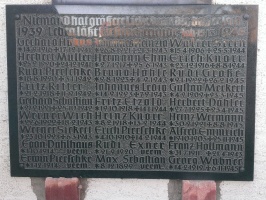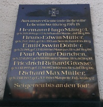 1. Weltkrieg: Aus unsrer Gemeinde ließen ihr Leben im Weltkrieg 1914-1918; Sei getreu bis an den Tod 2. Weltkrieg Niemand hat Größere Liebe denn die, daß er sein Leben läßt für seine Freunde Joh. 15.13