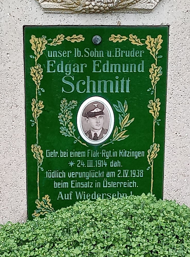Steinstele mit eingesetzter Namenstafel aus Metall im Friedhof von Burghausen. Im Sockel eine Sterbeszene. Vor dem Sockel eine Namensplatte aus Stein. Ergänzende Daten stammen von Sterbebildern aus der Sammlung Liepert (www.liepert-arnstein.de).