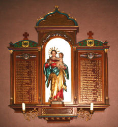 nordwestlichen linken Seitenwand eine dreiteilige Holztafel zur Erinnerung an die Kriegsopfer der Pfarrei