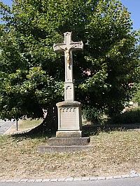 Bei der kath. Kirche: Kreuz auf einem Sockel, Inschriften am Sockel