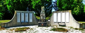 Betonwand mit Namenstafeln neben dem Friedhof steht auf einem Sockel die Skulptur zweier Soldaten vor einer
