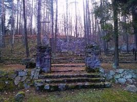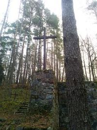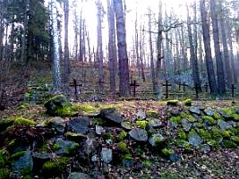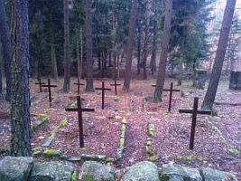 Im Wald liegender Friedhof am Ende des Dorfes Drweck mit 60 Gräbern aus dem 1. Weltkrieg.