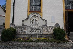 An der Kirche; Denkmal, in der Mitte erhöht mit Steinrelief „Maria schützt Soldaten“, Inschriften, davor schräg angelehnte Gedenktafel