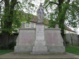 Ein mehrstufiges quadratisches Denkmal, das den Namen des Gefallenen des Krieges 1870/71 trägt, obenauf steht Maria,