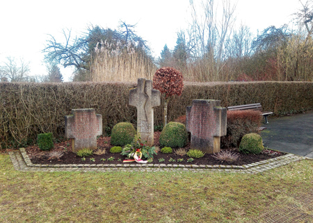 Standort ist auf dem Friedhof. Mittig ein größeres Kreuz mit Gedenkinschrift,