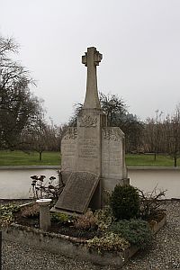Im Friedhof; Denkmal, oben mit Steinkreuz, vorne angelehnte Tafel