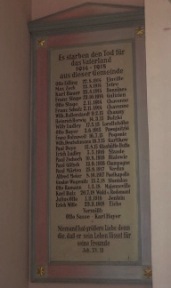 Gedenktafel Erster Weltkrieg: Es starben den Tod für das Vaterland 1914 – 1918 (Angaben) Niemand hat größere Liebe denn die, dass er sein Leben lässet für seine Freunde, Joh. 15.13