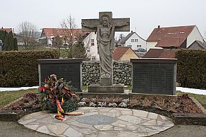Bei der Kirche ein steinernes Kreuz mit Bildrelief „Jesus“, flankiert von zwei Steintafeln; zusätzlich Hinweise zu