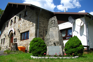 Natursteindenkmal vor der Gaststätte „Lug ins Land“ am Ortsausgang. Die Tafel für den 1. Weltkrieg ist in den Stein eingelassen, die für den 2. Weltkrieg liegt davor.