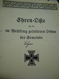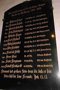 Gedenktafel 1. Weltkrieg in der Kirche; Ehrenlisten für die Gefallenen des 1. Weltkriegs; Gedenken auf
