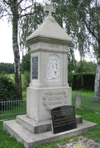 Denkmal am Ortseingang mit eingelassenen Steintafeln für die Teilnehmer und Opfer des 1. Weltkrieges. Für die Gefallenen und Vermissten des 2. Weltkriegs wurde später eine Tafel vor dem Sockel angebracht.