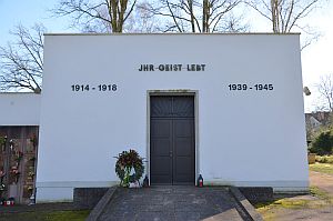 den Jahreszahlen über dem Eingang der Trauerhalle an die Gefallenen und Vermissten der beiden Weltkriege. Auf
