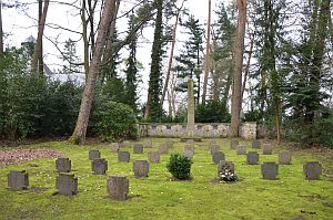 ind. Davor ist ein Gräberfeld in fünf Reihen, bestehend aus 31 Grabkreuzen für Soldaten, die hierher